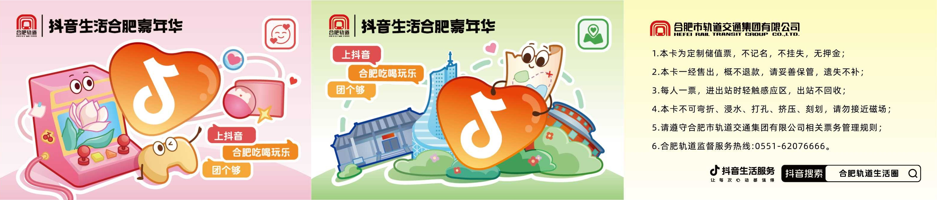 商圈的热闹为城市消费添了把火,而要让这把火烧得更旺、更持久,就需要把消费的触角伸向市民生活的更多角落。地铁向来是合肥市民高频依赖的公共交通方式,在此场景中,平台创新性落地全国首个地铁卡抖音团购项目,同步推出抖音渠道专享的吃喝玩乐主题定制联名地铁卡、“囍”结良缘主题文创票等,用户可享最低8折优惠进行购买,预计在9月底上线抖音平台。