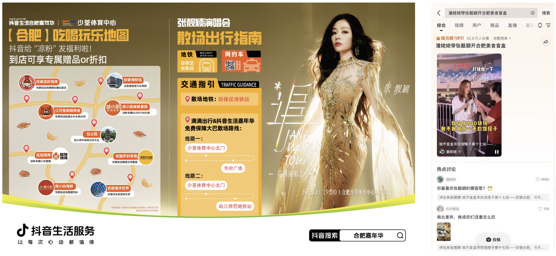 为进一步挖掘城市消费潜力,拓展消费增长的新维度,抖音生活服务巧妙借势合肥演唱会、签售会等明星事件的影响力,将明星热度与本地商家需求、热点传播深度绑定,打通了“明星流量→热点发酵→商家转化”的路径。