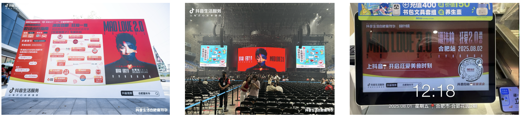 潘玮柏演唱会期间,抖音生活服务在场馆内设置巨型嘉年华打卡墙、循环播放合肥美食地图大屏,在场外推出歌迷专属定制大巴,让歌迷从入场到离场的全流程都能接触到商家信息。这种从场外到场内的“全域包围”,为15个合作商家600+门店带来巨大的流量关注与扫码增长,直接带动搜索支付环比增长27.5%、线下进店物料扫码支付环比暴涨409%。