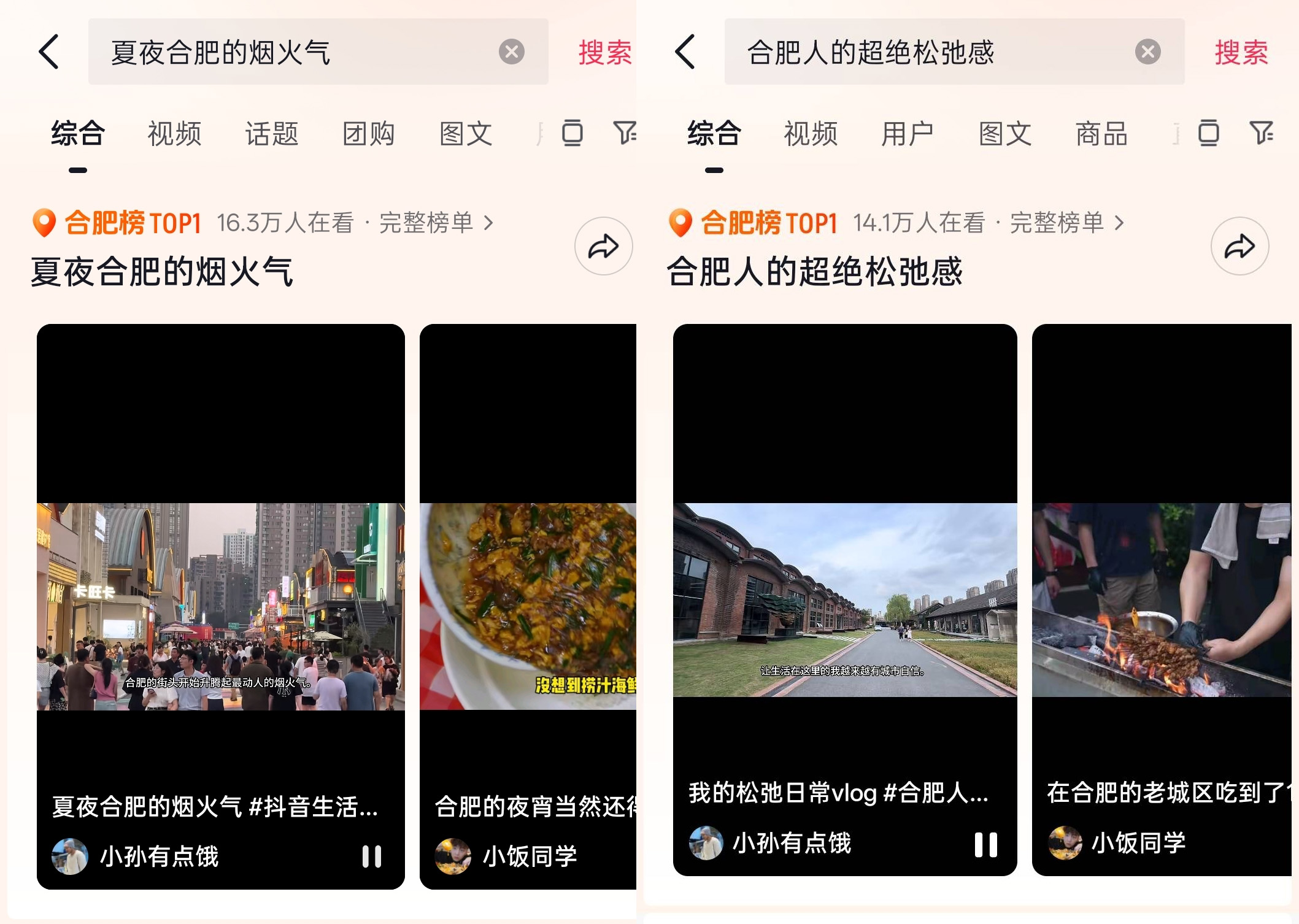 普通用户的广泛参与,是活动天然的声量放大器。围绕合肥夏日消费场景,活动推出#夏夜合肥的烟火气、#合肥人的超绝松弛感?两大核心话题,聚焦夜市烧烤摊、百大购物的夜间促销、市民饭后逛商圈的日常,鼓励用户分享属于自己的合肥夏日记忆。随着越来越多用户积极融入这场城市级讨论,两条话题先后登顶抖音同城热榜TOP1。这种全民共创的氛围,不仅让嘉年华的声量实现指数级发酵,更让“上抖音过浪爽夏天”的记忆,深深扎根在合肥人的城市体验中,成为专属这座城市的消费记忆符号。