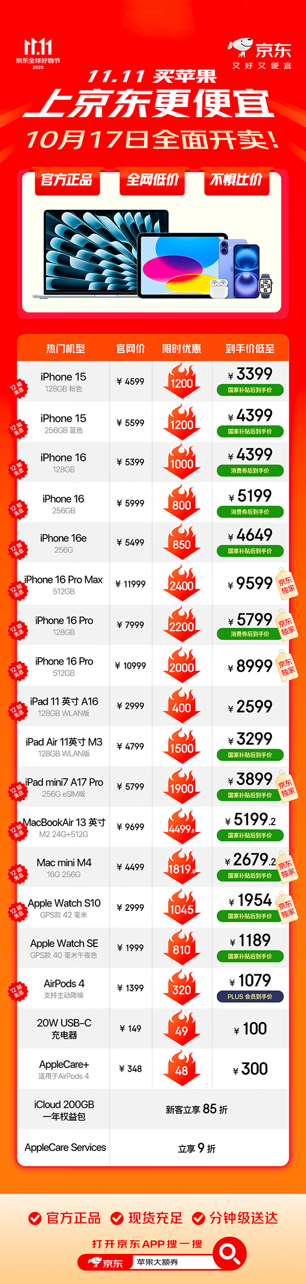 每年11.11对于广大果粉而言无疑是换新的绝佳时机,无论是追求最新款还是预算有限入手上一代机型都能享受到极具吸引力的价格。10月17日,京东率先启动Apple产品大促,覆盖iPhone、iPad、MacBook等多条产品线,为不同需求的果粉提供了丰富多样的选择。其中,iPhone 17系列至高可减500元,以旧换新加补至高500元、iPhone 16系列限时优惠高达2400元、iPhone 15限时优惠1500元;新款MacBook Pro不仅限时优惠2000元,以旧换新还可享额外加补1500元。想换新的消费者,打开京东搜“苹果大额券”即可进入活动会场,多重权益享不停。