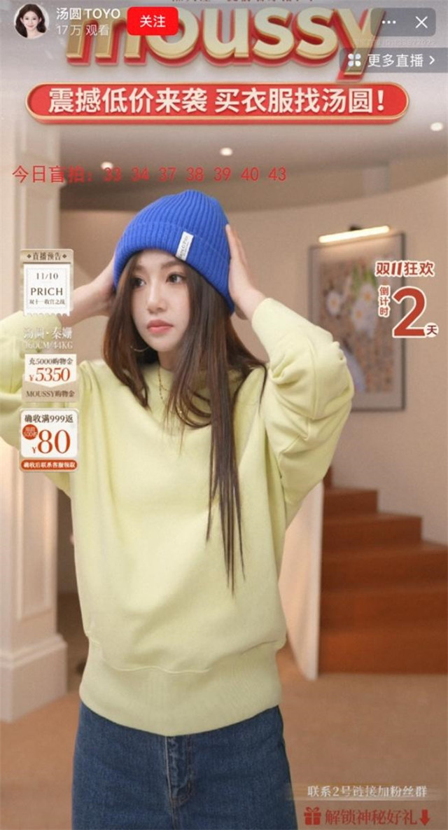 如今,汤圆已与多个中高端服饰品牌建立起稳定合作关系,从MO&Co.到Teenie Weenie,从新锐设计到经典国货,她的直播间逐渐成为品质服饰的“信任入口”。今年双11,她单场成交稳定在百万量级,且稳中有升。在电商直播存量竞争的背景下,这份稳健恰恰印证了“专业+信任”模式的长期价值。