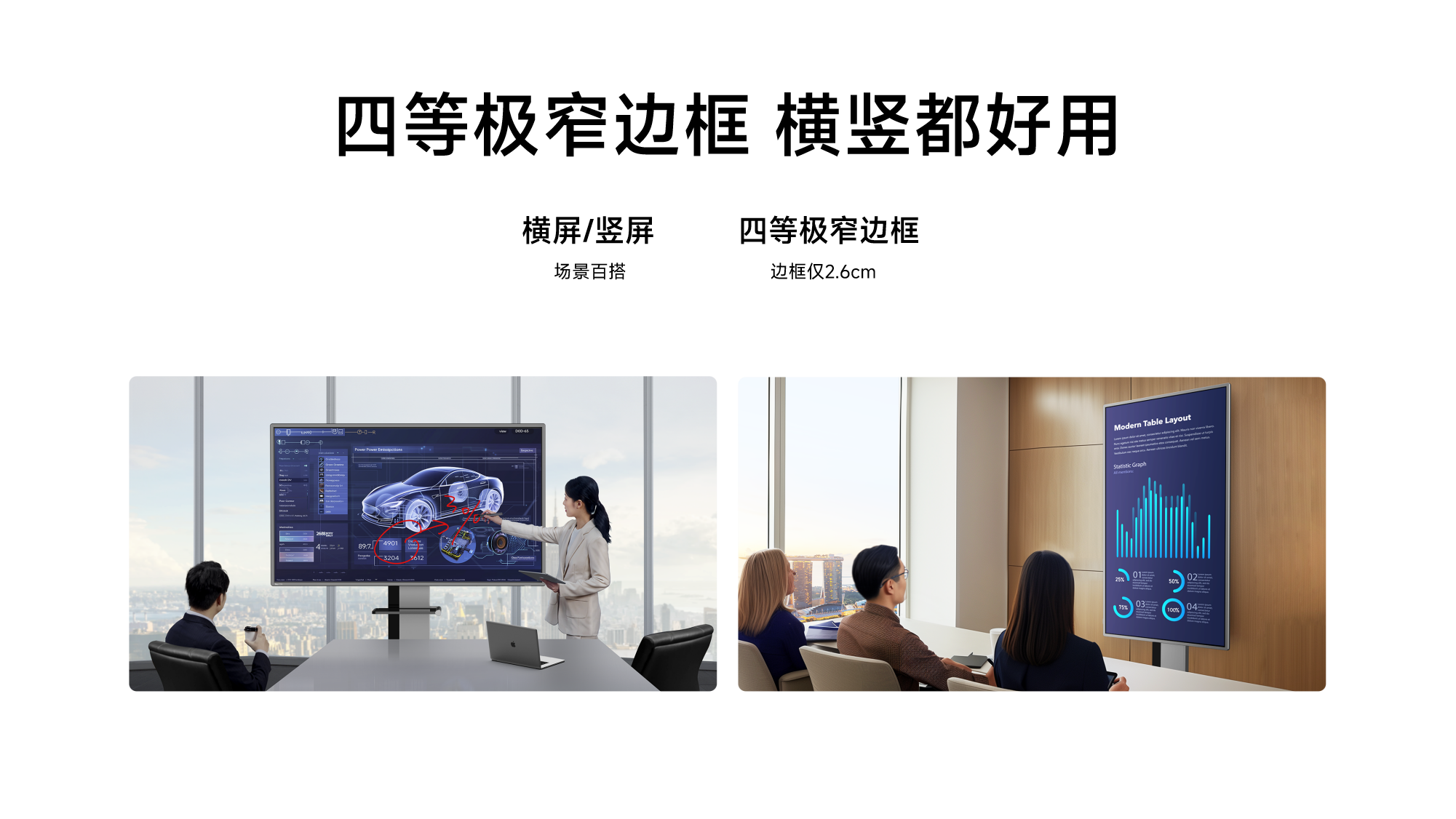 作为常年畅销爆款,这款产品采用四等窄边框设计,不仅可以横屏安装还支持竖屏,满足了更多场景互动展示的需求,不仅适用于会议场景,还可以当作迎宾接待屏、互动广告机、直播大屏等等,基本上把用户所有的应用场景全考虑进去了。