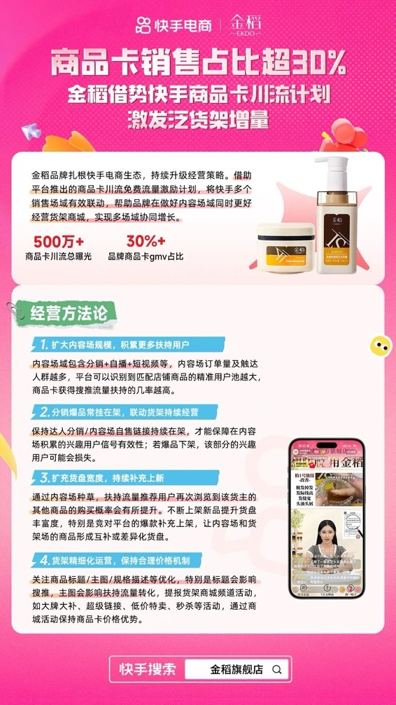 围绕泛货架这一高速增长场域,快手商品卡川流计划从扶持流量、高效成交、协同增长等多维度,帮助金稻等品牌实现全域经营跃迁,获得更多确定性生意增量。