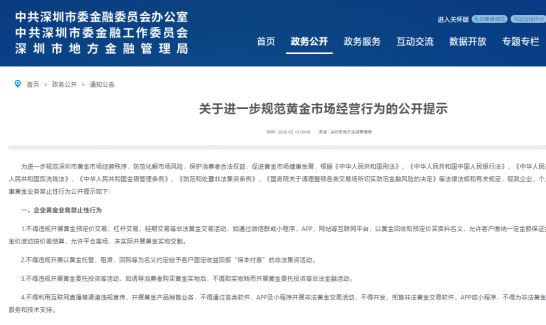 近日深圳"十部门联合整治黄金市场"专项行动明确指,金融机构未按规定向金融监管部门备案或获得审批,不得开展黄金业务,不得违规开展黄金预定价交易、杠杆交易、延期交易等非法黄金交易活动,不得为相关非法黄金交易软件、APP或小程序提供信息服务和技术支持,不通过各类软件、APP及小程序参与非法黄金投资行为。