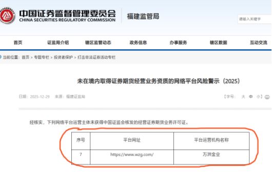 去年年底证监会发布风险警示,万洲金业因未取得中国证监会核发的经营证券期货业务许可证被公开点名,证监会郑重提醒请广大投资者提高风险防范意识。