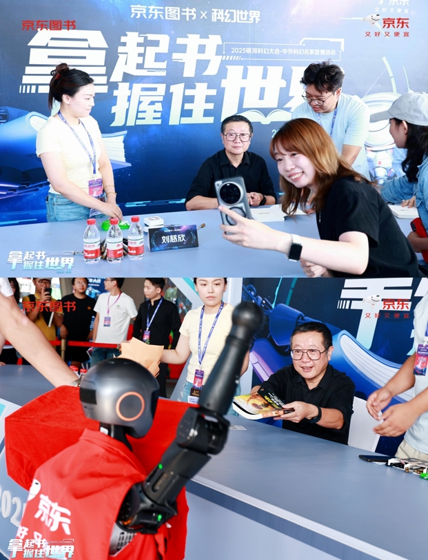 作为大会的特别支持方,京东在大会现场设置了“拿起书,握住世界”主题展区和“AI探索编辑部”互动区,并推出线上活动会场,广大读者和现场观众不仅可以在现场的售书区和AI产品体验区打卡解锁福利,赢取限量好礼,还可以通过京东直播间云逛展,共享这场科幻盛宴。大会开幕当日,京东还联合《科幻世界》杂志社共同举办中外科幻名家签售活动,并推出“科幻领航计划”,加大优质科幻作品的曝光与推广力度,引发了各方的广泛关注。