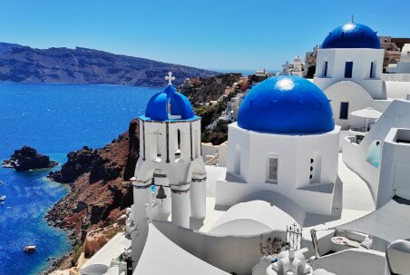 著名的蓝顶教堂集中在伊亚和费拉小镇,这个教堂规模不是很大,但是因为有了蓝白相间的颜色与大海融为了一体,所以这里充满了梦幻色彩。这里的教堂被收录到了国家地理杂志,这是三座相邻的小型礼堂,建于19世纪末期,由当地的渔民们集资修建,主要是用于出海前的祈祷,以保渔民平安顺利,后来伊亚的蓝顶教堂主要分布在悬崖两侧。