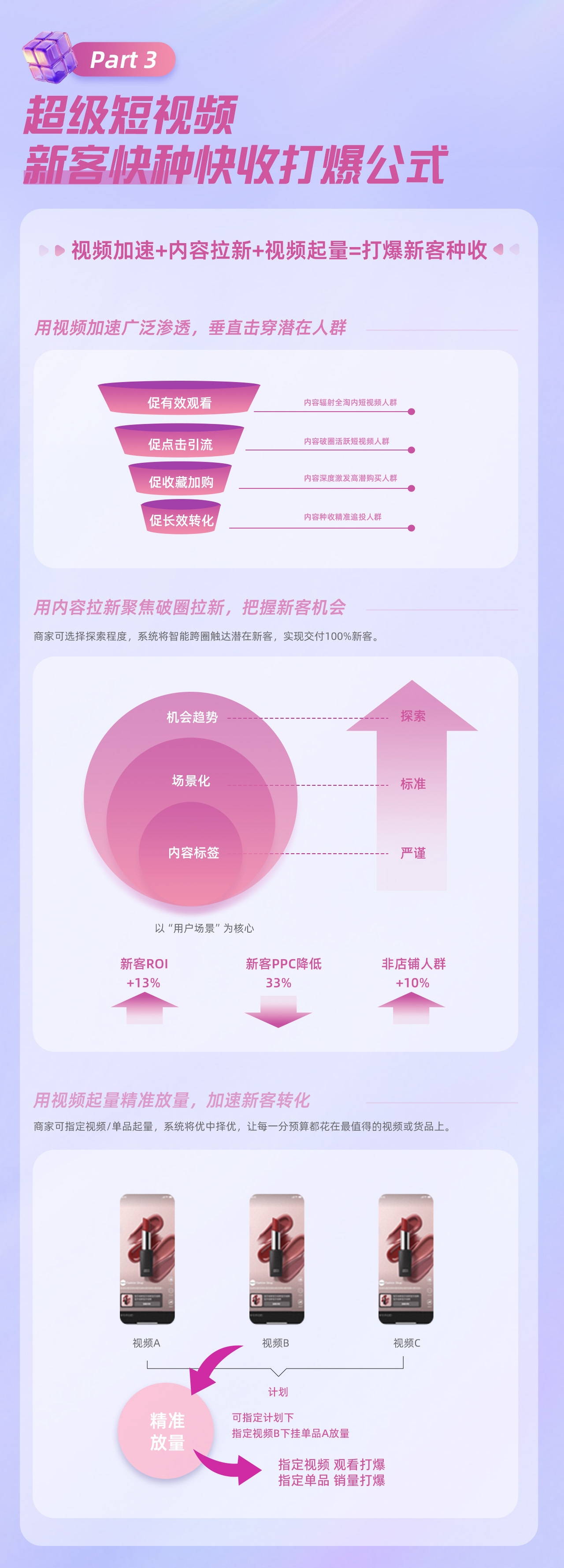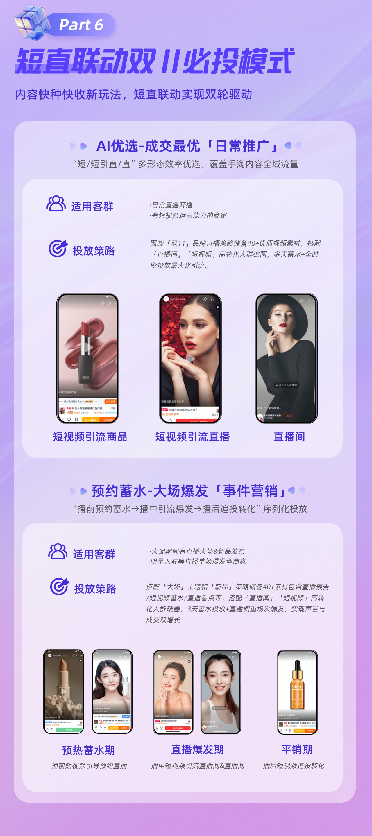 市场迸发的消费活力、产品能力的升级提效,再加上每月2次超级88的经营节奏变化,注定了今年双11商家需要采取全新的内容营销策略,乘上这波平台助推的全域增长东风。查看下方《经营蓝宝书产品篇——产品快种快收加速包》,即刻解锁双11内容营销投放攻略!