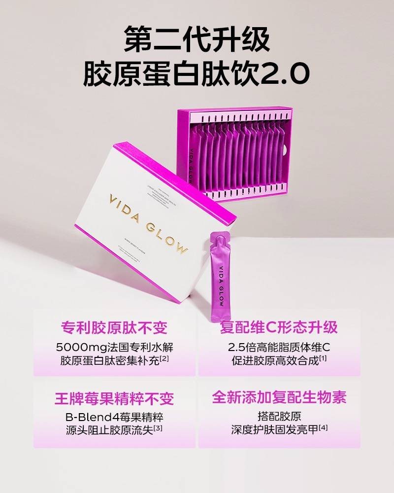 “胶原蛋白肽饮2.0不仅有全新配方,本身也传承了1.0版本非常优秀的品质。”作为七年老粉,方小姐对Vida Glow的每款产品都如数家珍。胶原蛋白肽饮1.0于2023年上市,迄今已全球热销近1000万条,先后斩获三项全球美容大奖。和1.0版本一样,2.0版本保留了法国专利水解胶原蛋白肽和B-Blend4王牌莓果精粹,以及“撕袋即饮”的便捷包装,可以在多元化的场景中高效补充胶原,并帮助肌肤建立“胶原防护墙”,阻止胶原流失。