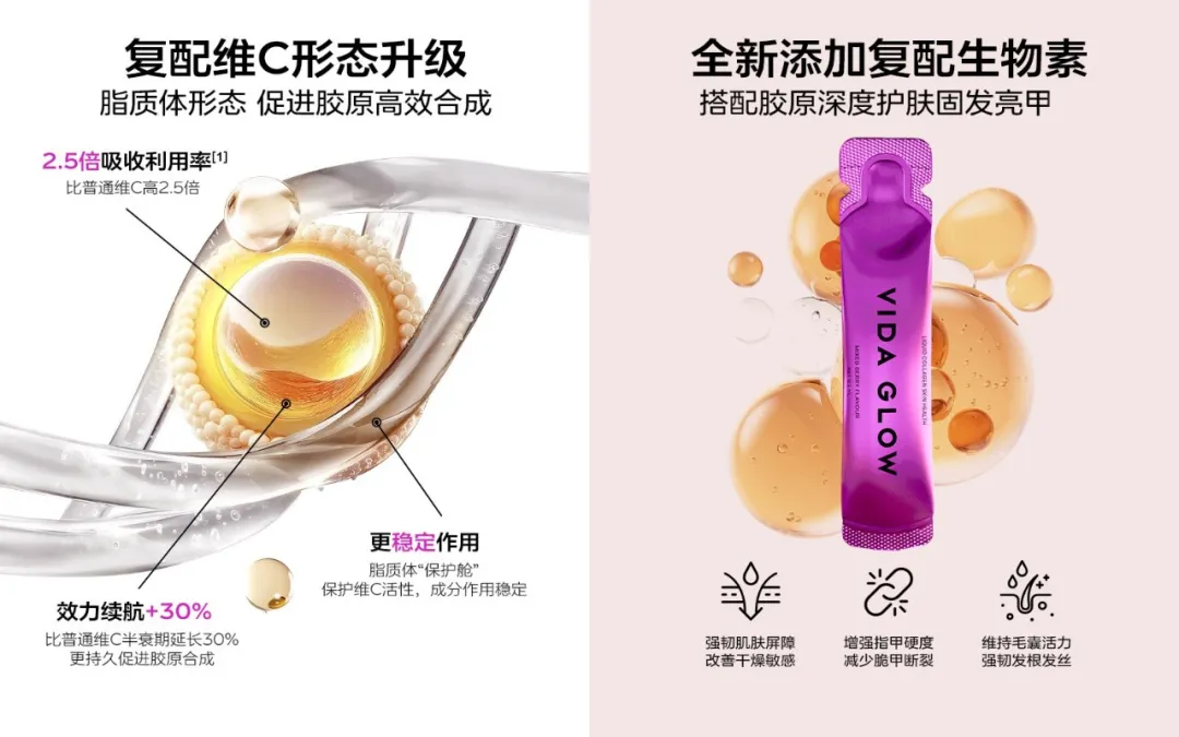 维生素C大约能将胶原蛋白合成效率提升8倍,Vida Glow胶原蛋白肽饮2.0在此基础上融入新型药物制剂科技—脂质体包裹技术,将维生素C的吸收利用率提升了2.5倍,效力持续时间提升了30%。“脂质体由双层磷脂分子构成,与人体细胞膜非常相似,能够保护维生素C不被胃酸、消化酶等破坏降解。”何志勇在直播中为大家讲解的脂质体包裹技术,最初主要应用于抗癌药物、疫苗等领域,通过Vida Glow的创新实践,成为VTN平台在临床医学与健康美丽消费交汇融合的鲜活案例。