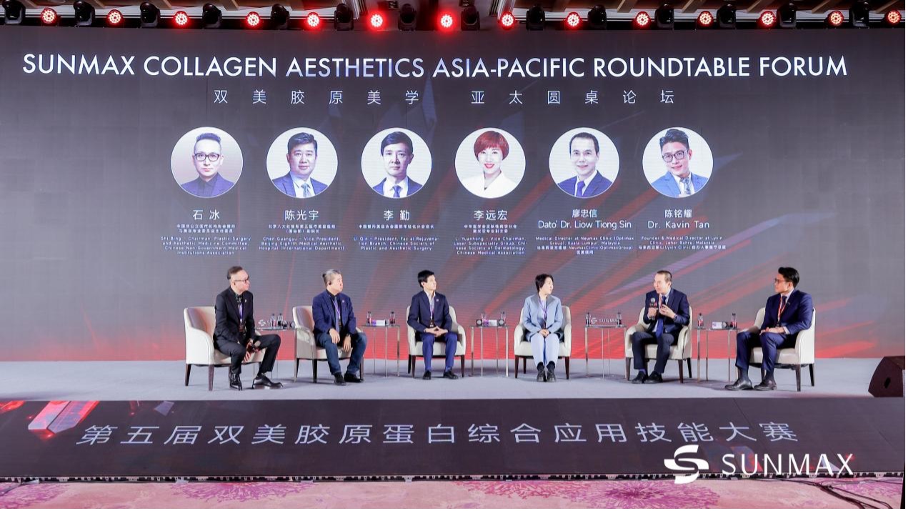 在三个环节的比拼之后,石冰教授、陈光宇教授、李勤教授、李远宏教授与来自马来西亚新山Lyvin Clinic的创办人兼医疗总监陈铭耀医生(Dr. Kavin Tan)、马来西亚吉隆坡Neumax Clinic医美顾问廖忠信医生(Dato' Dr. Liow Tiong Sin)开启了《双美胶原美学亚太圆桌论坛》的讨论,众位海内外专家针对可注射型胶原蛋白在医美方面的应用展开了激烈的探讨。