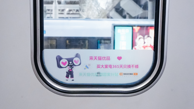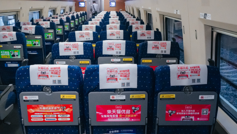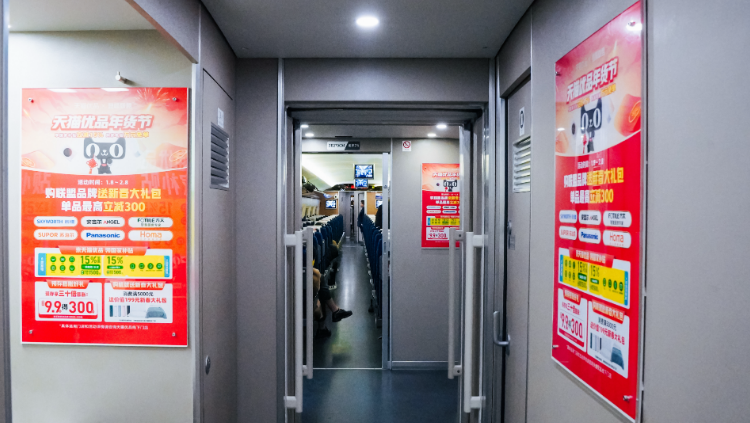 春节是家庭消费决策的关键节点。天猫优品以春运高铁为载体,将“只换不修”售后服务转化为可视、可感、可信的标杆符号——车体标语醒目,车厢内头枕巾、小桌板、行李架等细节融入品牌承诺,结合“登峰联盟6大品牌”年货节权益,打造沉浸式体验空间,加速品牌心智渗透,引爆年货节消费。